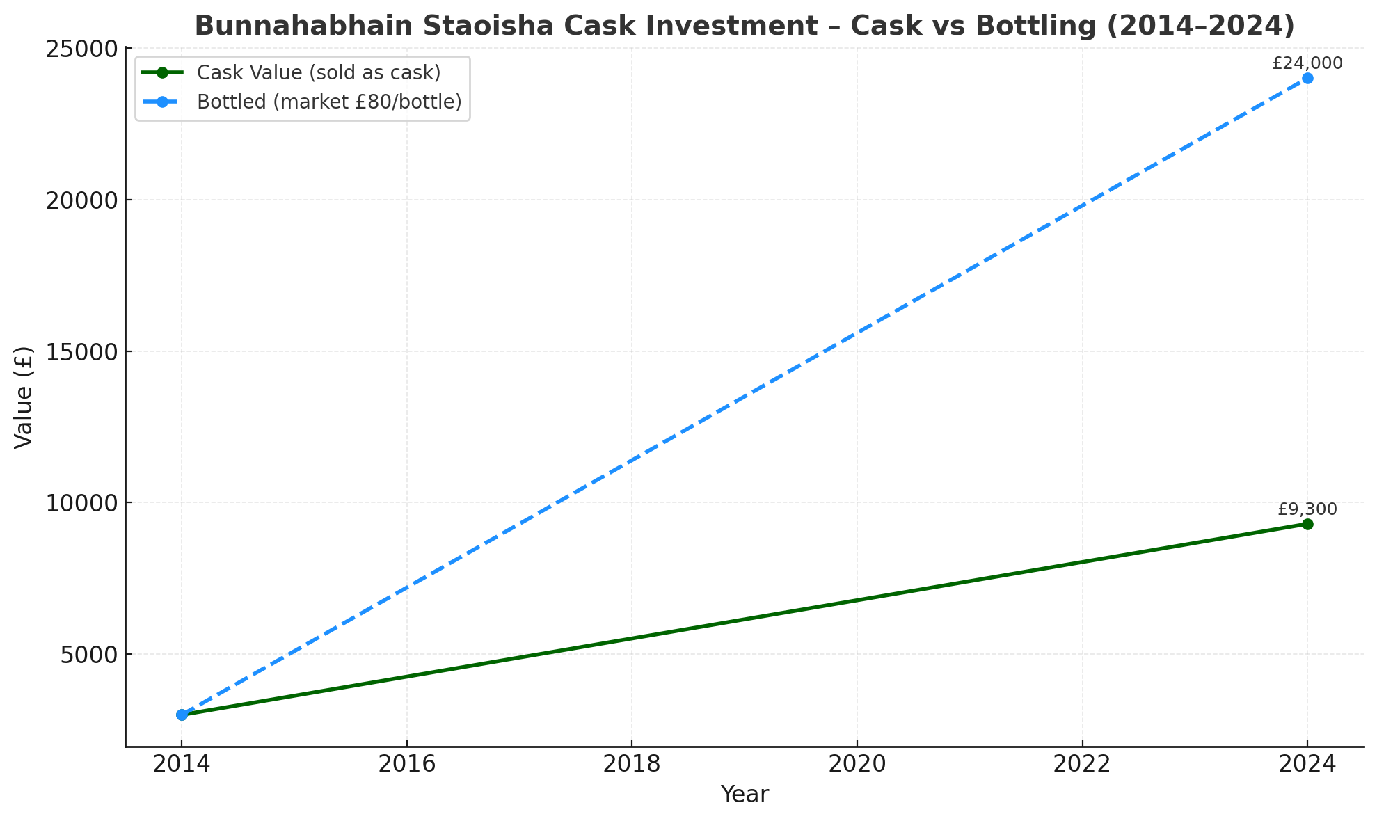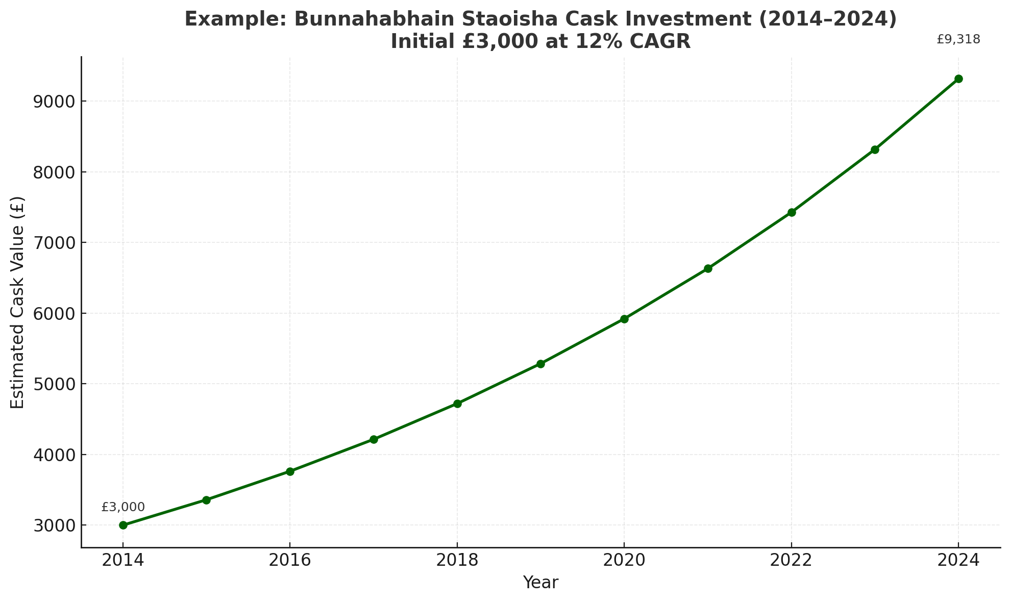 דוגמה להשקעה בחבית Bunnahabhain Staoisha שנרכשה בשנת 2014 בעלות של £3,000 בלבד. בהנחת תשואה ממוצעת של כ־12% לשנה (ריבית דריבית), ערך החבית הגיע בשנת 2024 לכ־£9,300 – יותר מפי שלושה מערכה המקורי.