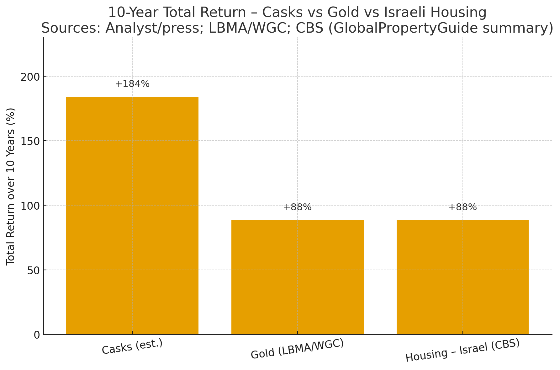 - חביות וויסקי – תשואה שמרנית של כ-184% (בהנחת צמיחה שנתית ממוצעת של 11%).